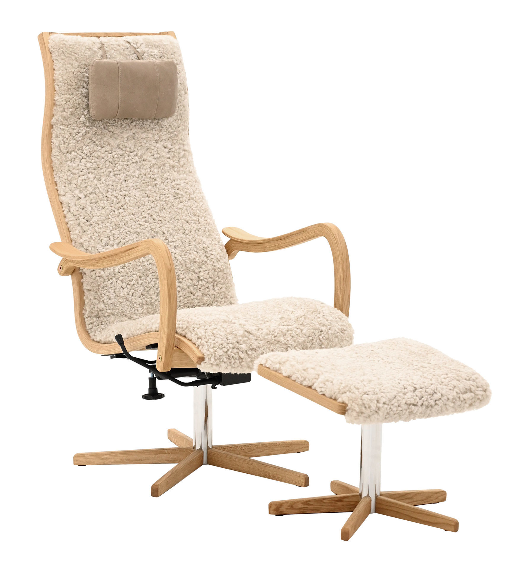 MUSSE Snurrfåtölj inkl pall fårskinn Moonlight/linneväv natur/Vintage taupe/oljad ek/krom/träfot PAKETPRIS *NY*