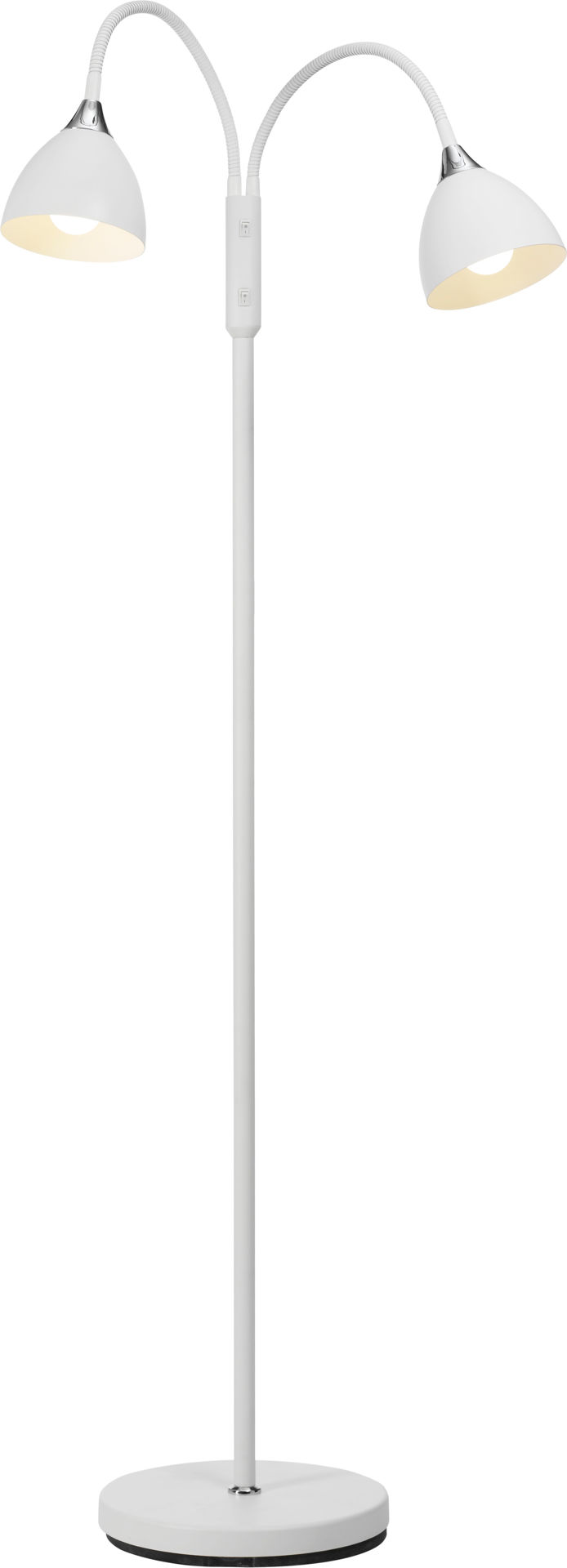 Golvlampa i ett modernt och klassiskt utförande. Den stilrena designen gör att den passa i de flesta hem. Har två riktbara huvuden som gör den perfekt för läsning för två samtidigt. Golvlampan 132 cm i höjd och har en sladd som är 190 cm lång. Behöver kompletteras med en ljuskälla med E14 sockel (max 40 W).