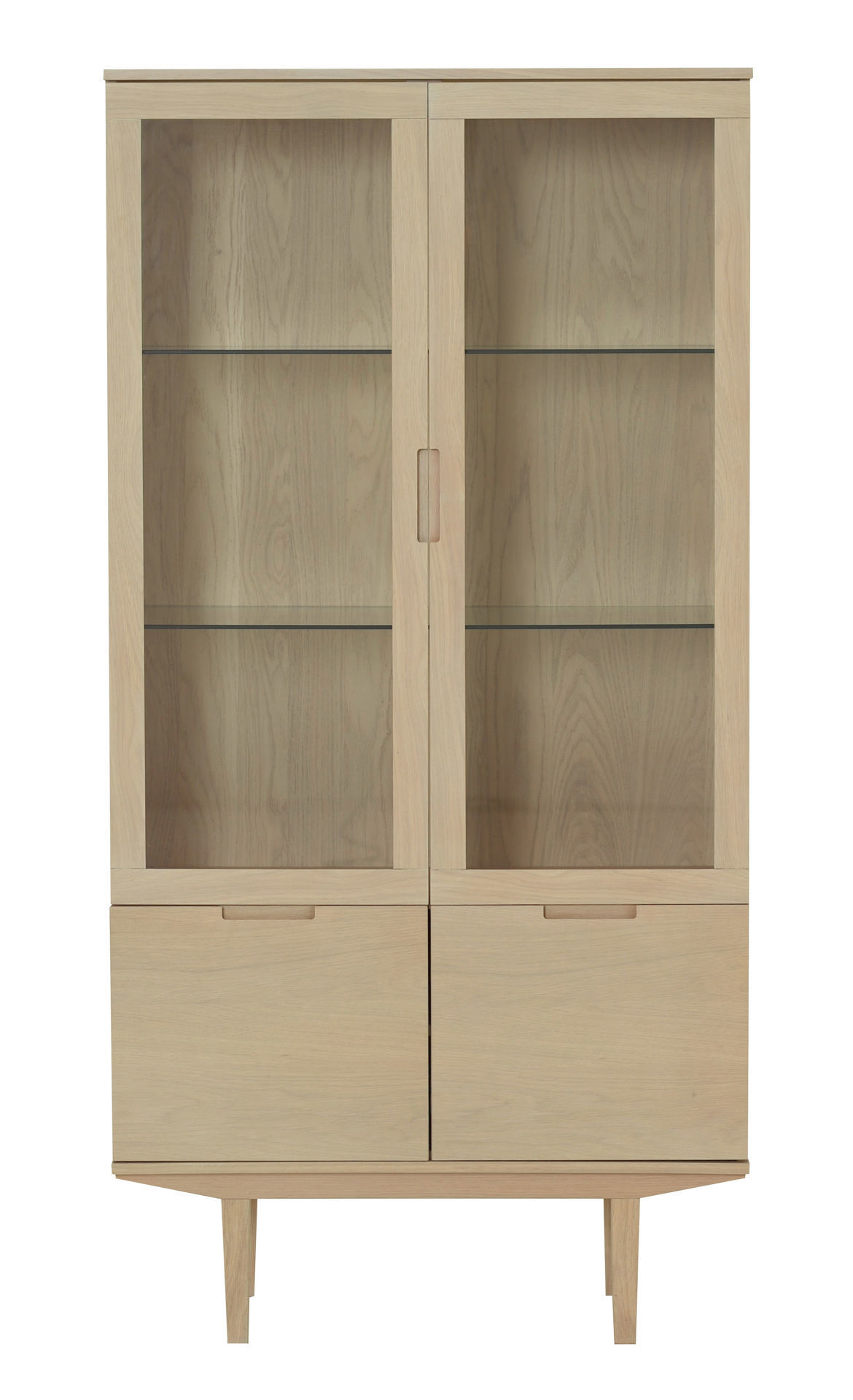Sagamore i vitpigmenterad ekfanér är ett ljust och elegant vitrinskåp som ger rummet en fräsch, skandinavisk känsla. Skåpet har fyra dörrar och kombinerar praktisk dold förvaring med vackert glasade fack där du kan visa upp porslin, böcker eller dekorativa detaljer. Den integrerade LED-belysningen lyser mjukt upp hyllplanen och framhäver innehållet, vilket gör vitrinen till ett stilsäkert inslag i hemmet. Med sin ljusa träton och tidlösa design passar Sagamore vitpigmenterad ek perfekt i vardagsrum, matsal eller hall — och blir en elegant detalj i både modern och klassisk inredning. Finns i flera färger.
