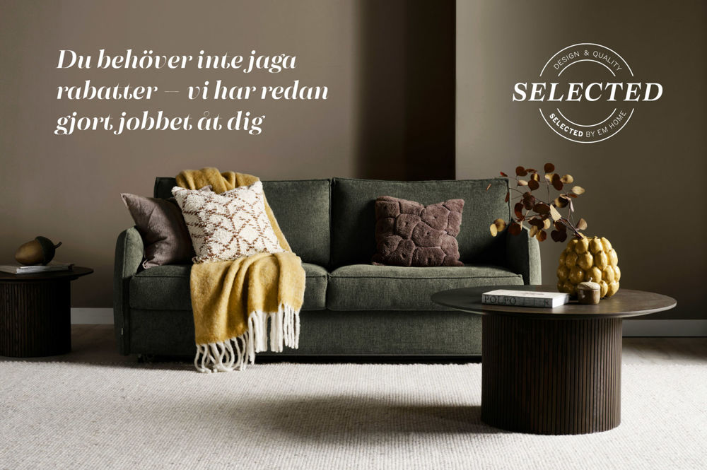 Svar: Selected by Em home är utvalda modeller i särskilt utvalda tyger där priset redan är pressat. Därför är de aldrig med i kampanjer – du får alltid bästa pris, oavsett när du handlar.
