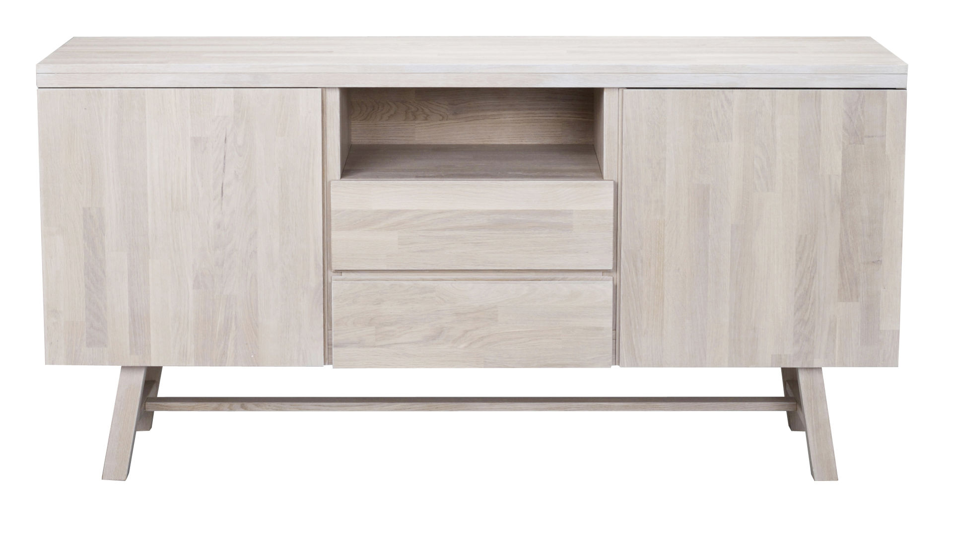 Funktionellt sideboard i stilren design med gott om förvaring. Sideboard i massivt ek som behandlats med vitpigmenterad hårdvaxolja. Lätt utställda ben och luckor och lådor med mjukstängande funktion.