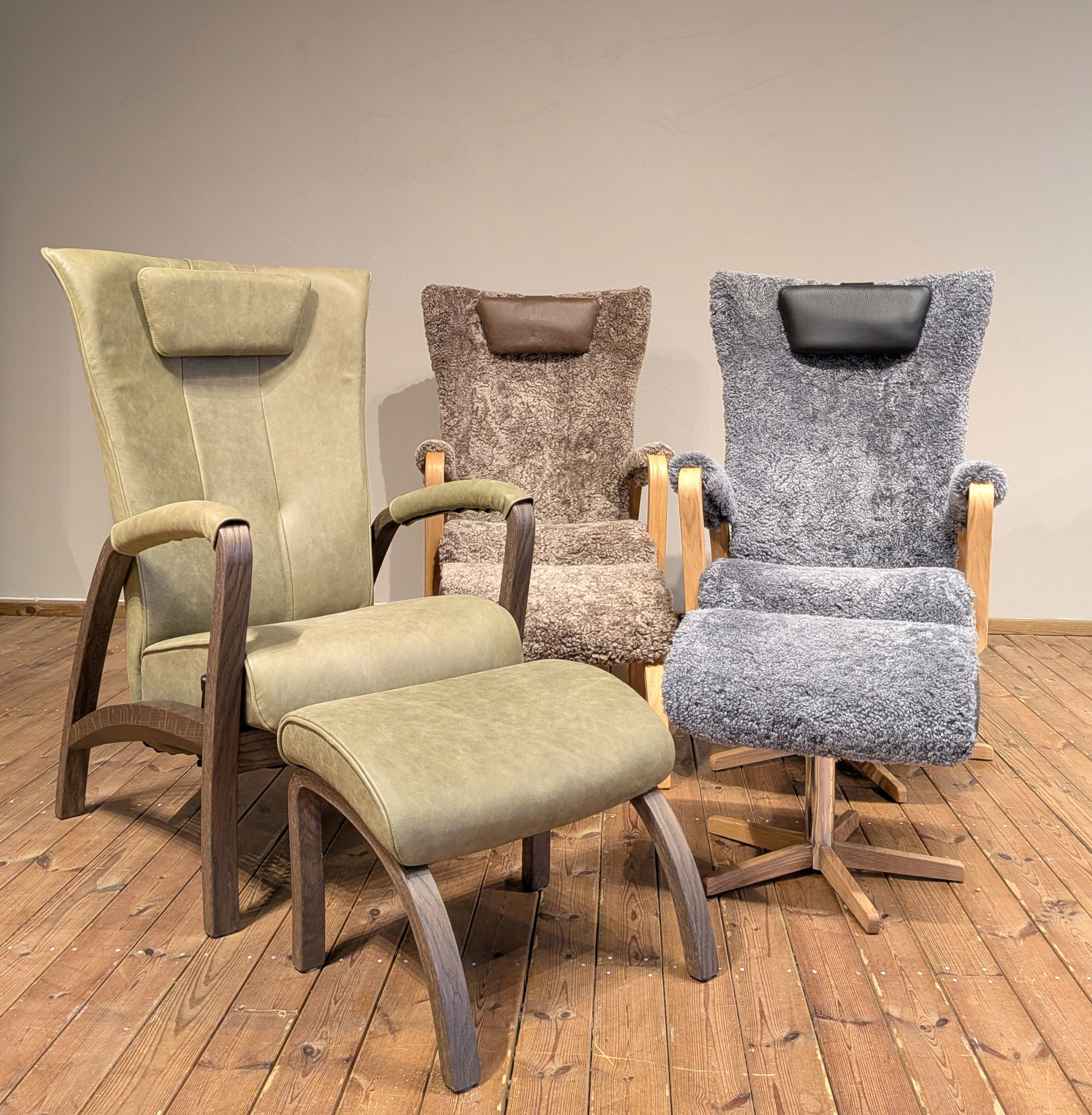 Förutom att Relax går att få i alla Bröderna Anderssons tyger, läder och fårskinn så finns den i två versioner, med ben eller som snurrfåtölj.