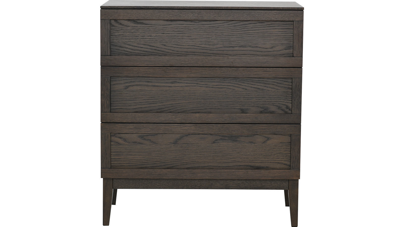 Stavin är en praktisk byrå i brunlackad ekfanér med tre rymliga lådor, som erbjuder diskret och funktionell förvaring för kläder, textilier eller andra hushållsdetaljer. Byrån mäter 80 cm i bredd, 42 cm i djup och 89 cm i höjd, vilket gör den smidig att placera även i begränsade utrymmen. Den mörka ekfanéren ger en varm, naturlig träfinish som passar i olika inredningsstilar — från klassisk till modern — och bidrar till ett harmoniskt uttryck i sovrum, hall eller vardagsrum. Lådorna är försedda med mjukstängande mekanism (soft-close) för en lugn och tyst öppning och stängning. Stavin är ett bra val för dig som söker en enkel, stilren och lättplacerad byrå med god förvaringskapacitet i brun ekfanér.