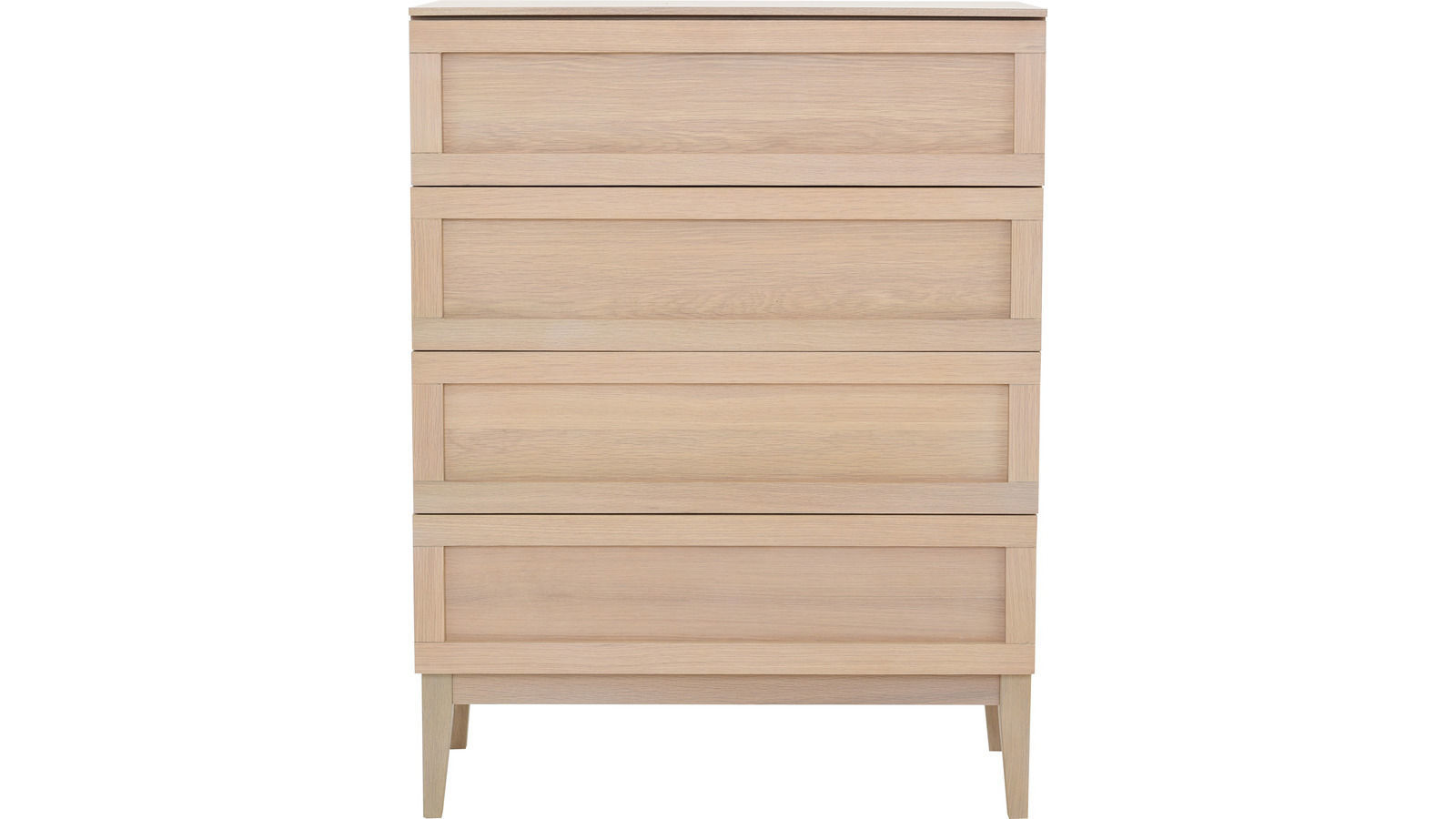 Stavin är en bred byrå i vitpigmenterad ekfanér som ger ett luftigt och skandinaviskt uttryck till sovrum, hall eller vardagsrum. Med sina fyra rymliga lådor erbjuder den generös förvaring för kläder, textilier eller andra hushållsartiklar. Byrån mäter 80 cm i bredd, 42 cm i djup och 105 cm i höjd, vilket gör den lättplacerad även i mindre utrymmen. Den vitpigmenterade ytan framhäver träets naturliga ådring och skapar en mjuk, ljus och harmonisk karaktär — perfekt för ljusa inredningsstilar eller för att balansera mörkare element i rummet. Lådorna är utrustade med mjukstängande funktion, vilket innebär att de öppnas och stängs tyst och smidigt. Stavin är ett praktiskt och stilrent förvaringsalternativ för dig som söker en rymlig byrå i vit ekfanér, med både funktion och ett lättplacerat format. Finns i flera storlekar och färger.