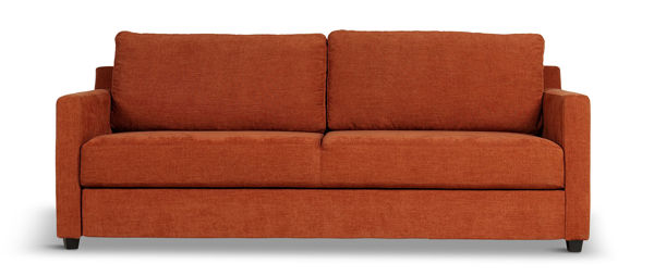 Stella bäddsoffa är en härlig soffa i lite större modell. Visas här i färgen rost. Soffan är längsbäddad och bäddas snabbt och enkelt upp. Det ingår två enklare bäddmadrasser/madrasskydd till denna soffa samt även 2 st prydnadskuddar (saknas på bilden).