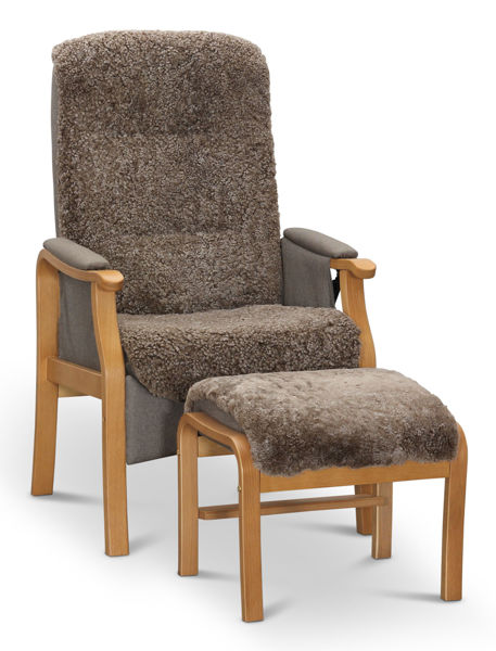 STINA fåtölj med pall elman. LiftUp, fårskinn Sahara/tyg Maison 21, armstöd ek