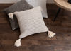 Kuddfodral i ett garnfärgat mönster i svart. Tofsar i hörnen och en enfärgad baksida med dold dragkedja.