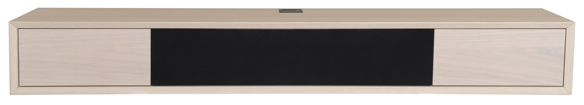 Praktisk vägghängd TV-bänk i vitpigmenterad lackad ekfanér. Två praktiska lådor och en dörr för att dölja förvaringen. Upptill finns en lucka med hål i för enkel genomföring av sladdar. Finns även i brunlackad ek samt i flera storlekar.